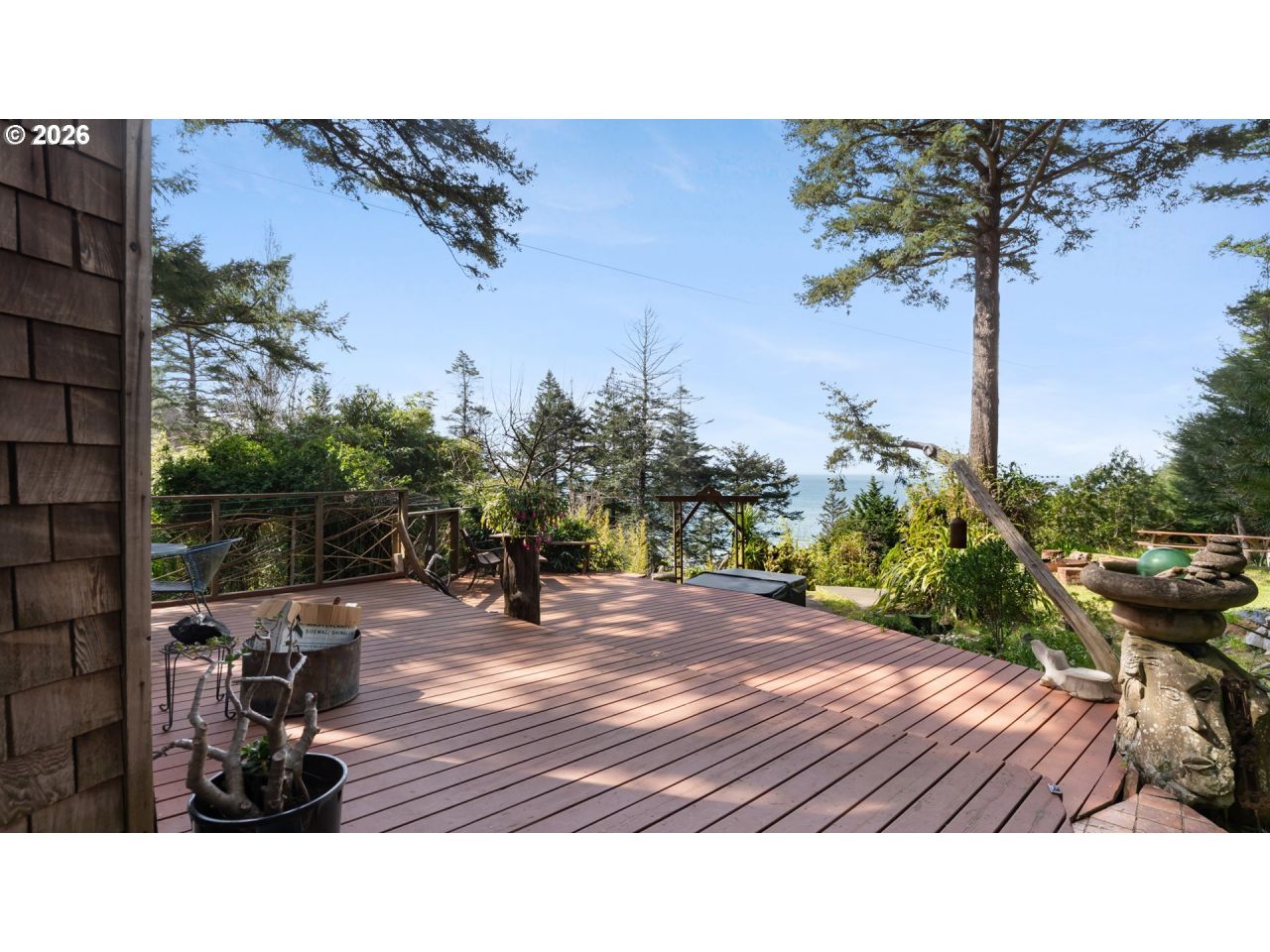 Just south of Port Orford, this exceptional 15-acre ocean-view property offers a rare blend of self-sufficient coastal living and development opportunity-steps from one of the most incredible beachcombing stretches on the Oregon Coast. Zoned RR-2, it allows for potential division into multiple ocean-view home sites, each enjoying unobstructable vistas of the Pacific, or the creation of a family compound, working homestead, or spacious private estate.The land benefits from a unique coastal microclimate with warm, sheltered garden areas, established fruit trees, a spring-fed water source, and a peaceful pond. Greenhouses and open meadows support year-round growing, while stands of mature timber provide both beauty and privacy.The hand-built artistic home features 3 bedrooms and 1.5 baths, crafted with rustic charm and natural materials. Two separate studio buildings with baths offer flexible space for guests, work, or creative pursuits. Step out onto the view deck to soak in the hot tub while watching the sunset over the ocean and listening to the rhythm of the surf.A pickleball court, abundant natural resources, and proximity to town conveniences complete the setting. With unobstructed ocean views from nearly every part of the property and iconic Humbug Mountain rising to the south, this is a true coastal sanctuary-ready for homesteading, inspired living, or thoughtful development along Oregon's wild, unspoiled shore.