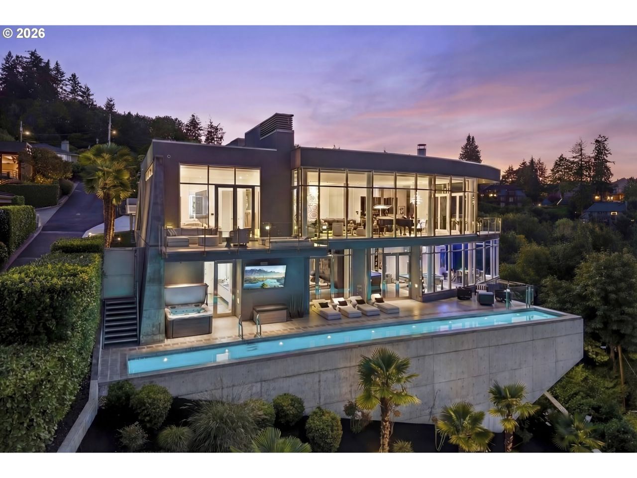 Perched high above Portland with one of the city's most commanding panoramas, this Iconic ultra-modern masterpiece designed by renowned architect Bob Thompson delivers an epic blend of architecture, light, and cinematic indoor/outdoor living. Walls of glass capture a sweeping 270-degree view of the skyline, river, and the Cascade mountain range, while multiple terraces, a dramatic 75-foot lap pool, and refined contemporary interiors create a lifestyle centered on spectacle and serenity. Nearly 7,300 square feet of meticulously updated living space offer grand entertaining areas, a luxe main-level suite, a chef's kitchen with Italian stone and Arclinea cabinetry, and resort-style amenities including a screening room, multi-level elevator, 3 car garage with a bar/TV with a oversized level and gated motor court, wine lounge, gym, and game room. With a seven-figure investment in recent upgrades, this home stands as one of Portland's most extraordinary, view-driven offerings and an unmatched opportunity for buyers seeking a truly iconic vantage point.