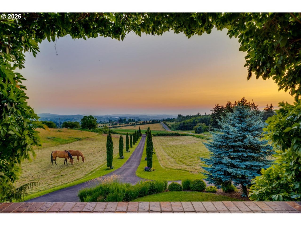 La Villa is a Georgian Farmhouse designed with rigorous proportions & commitment to symmetry. Centered on the front facade, the grand entrance is in line with the entry gate & cypress lined drive. Windows look out to spectacular sunsets, sparkling city lights and rolling pastoral vistas. The open plan features timber beams, 19-foot ceilings, abundance of sunlight shines across Brazilian cherry floors, chef's kitchen, sunroom, library, 4 fireplaces & a 22-car (3700sf) underground garage. 20 min drive to PDX, amenities, dining & shops.