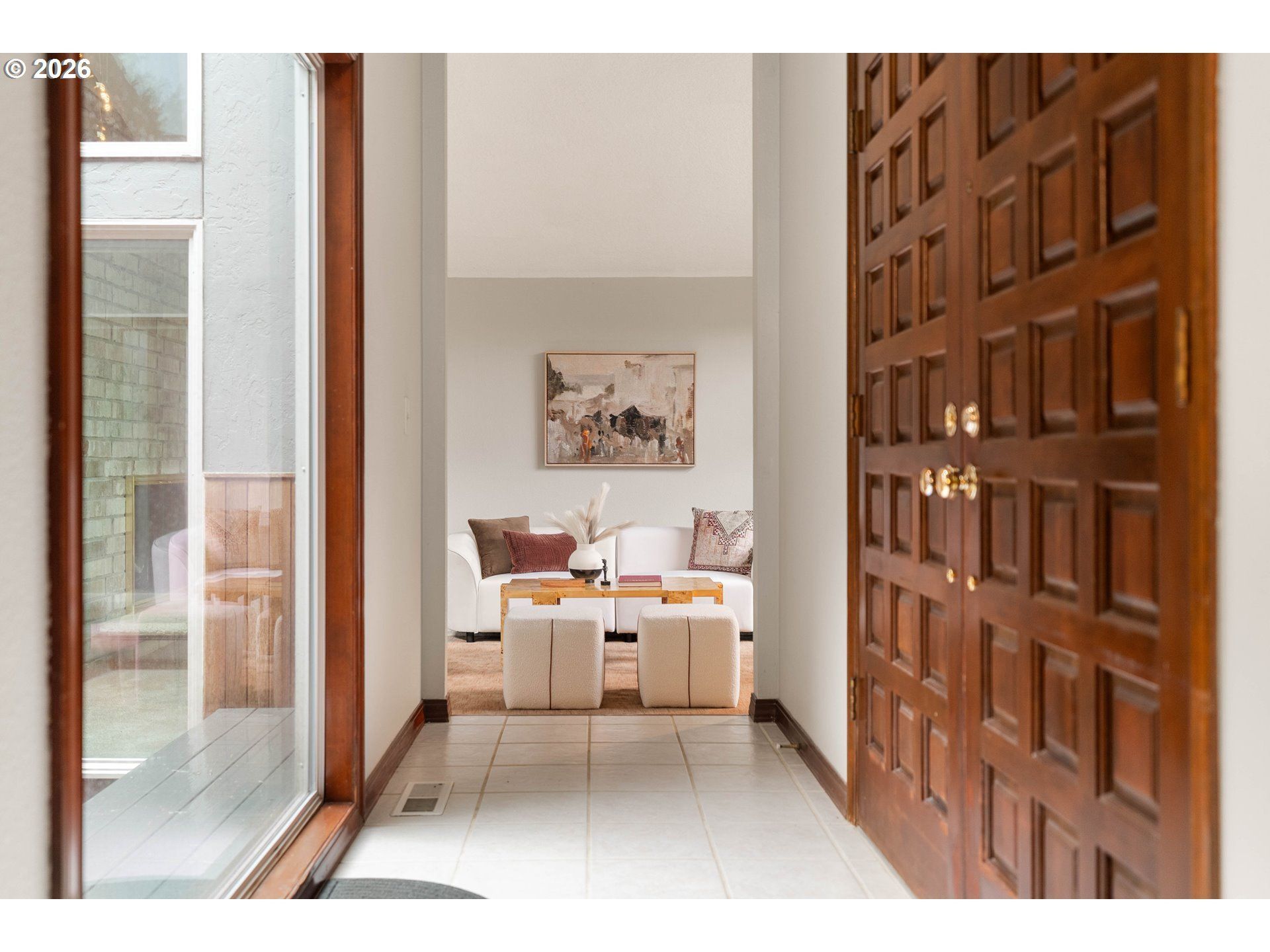 Tucked away on a generous lot in one of West Linn's most coveted neighborhoods, this beautiful mid-century home is a rare find - one that honors its architectural roots while delivering modern comfort and functionality. Clean lines and thoughtful craftsmanship define every corner of this 3-bedroom, 2.5-bathroom retreat. At the heart of this home lives something truly special: a private outdoor atrium set right in the center of the home. The flowing floor plan on the main floor unfolds with intention around this central courtyard. A spacious living room, separate family room, and formal dining room offer distinct spaces for every occasion, while the oversized kitchen delivers modern updates. A bonus office overlooking the backyard rounds out the main level - perfect for remote work, a creative studio, or a dedicated reading room. An attached two-car garage adds everyday practicality to all that charm. Upstairs, the generous primary suite is a true retreat - anchored by a large ensuite bathroom and a closet (or bonus flex space) that is sure to impress. Two additional bedrooms offer plenty of space for kids' rooms, a guest space, another office, or anything else your heart desires. A well-appointed guest bathroom serves the upper level with ease. Outside, the large lot gives you room to breathe - space for gardens, play, or simply the quiet that drew people to West Linn in the first place. All of this is just minutes away from historic Willamette, easy highway access, and all the amenities that West Linn has to offer.