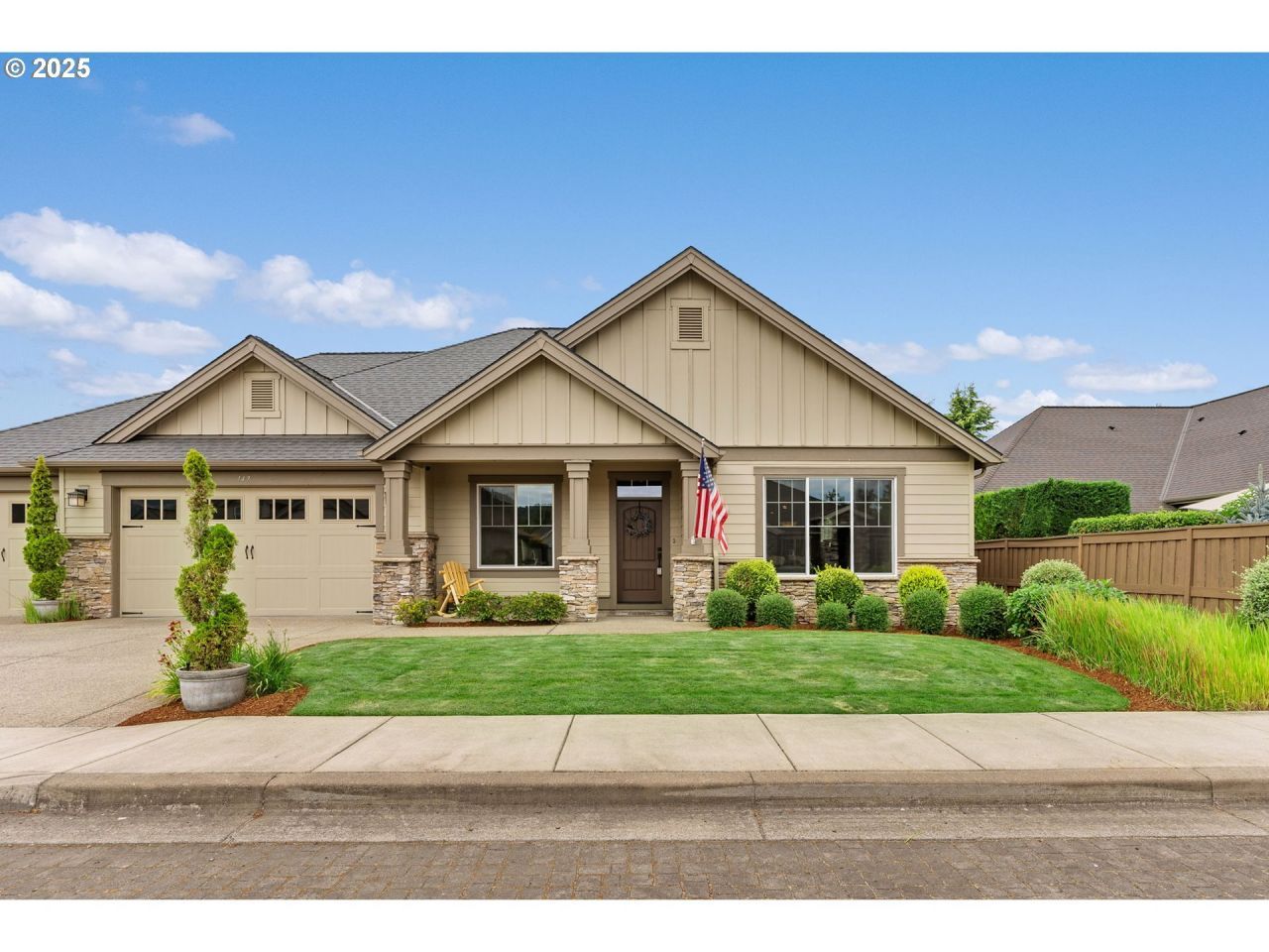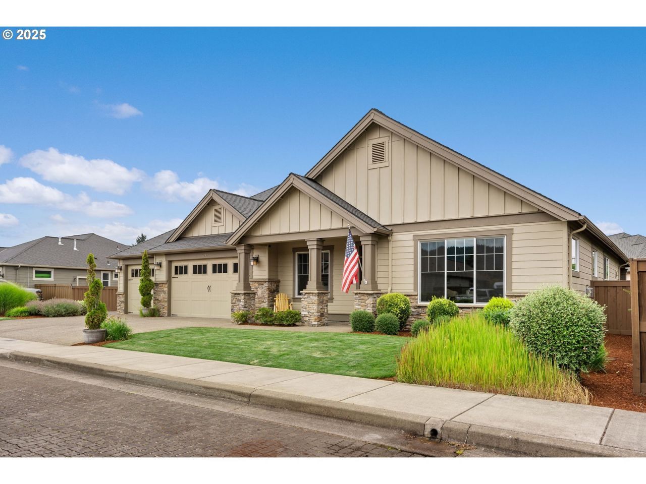 Discover The Reserve at Emerald Valley, an exceptional gated community developed by the award-winning Pahlisch Homes with a FOUR CAR GARAGE! This exclusive single-level residence exudes unmatched luxury, featuring stunning high cove ceilings, elegant wood floors, and a cozy gas fireplace. It showcases a spacious great room and an expansive kitchen equipped with quartz countertops, stainless steel appliances, an eating bar, a gas stove, a built-in microwave, and a dishwasher. The home includes four bedrooms, with the primary suite presenting a spa-like ensuite bathroom complete with double sinks, a walk-in tile shower, and a generous walk-in closet. The fenced yard, accompanied by a covered patio, is perfect for year-round entertaining. Additional features include a 4 CAR GARAGE and ample storage. Conveniently located near the Emerald Valley Golf Course and just minutes from Eugene, this home introduces The Creighton floor plan, offering plenty of space and comfort for any homeowner, all within walking distance to local shopping and coffee shops.