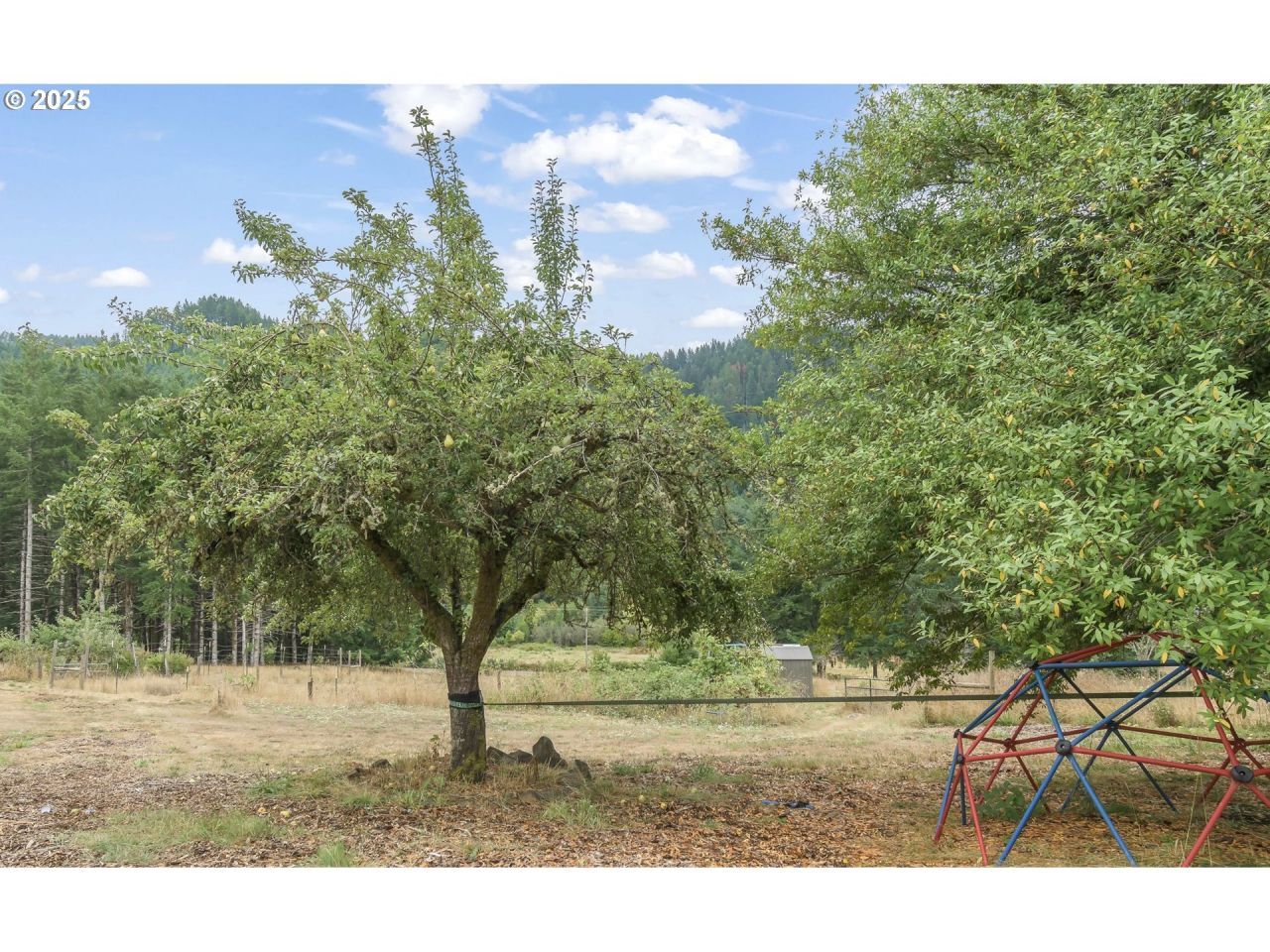 Secluded on nearly 15 acres, this 3,736 sqft lodge-style home blends rustic charm with modern convenience. The open great room features soaring ceilings, an exposed banister, and expansive windows that bring the outdoors in. A wood-burning fireplace and engineered hardwood and tile floors add warmth throughout.A highlight is the home automation system, giving you control of every light and offering three zones of high-resolution audio-a rare luxury in rural properties. Designed for multi-generational living, three of the four bedrooms include a private en-suite. The primary suite, accessed through French doors, offers a soaking tub, shower, and dual closets. Outdoor living shines with a large deck overlooking the terrain and a 3/4 wraparound porch. The chef's kitchen features stainless steel appliances, propane gas cooktop, and double ovens. The basement provides flexible space with a full bath and walkout access, while the oversized garage includes 896 sqft of additional living area, ideal for bedrooms or offices. Outside, the 42' x 45' barn offers concrete floors, dual roll-up doors, and two large stalls (expandable to four) with pasture access. A 12' x 45' lean-to adds storage, while a fenced fruit orchard and seasonal water feature enhance the property's charm. Located just 15 minutes from Triangle Lake and 40 minutes from the ocean, this property delivers rural tranquility with modern sophistication.