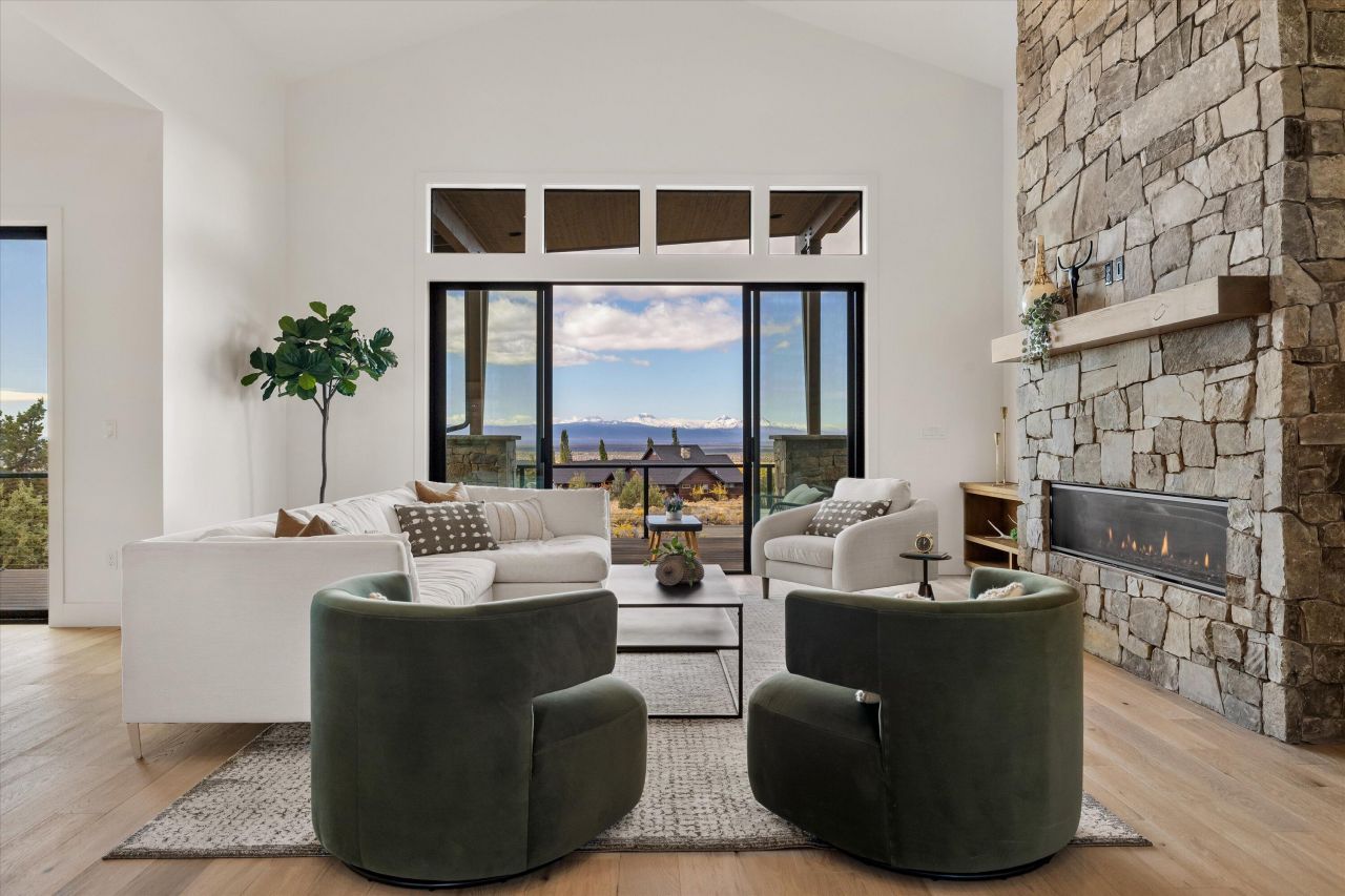 Mountain modern NEW CONSTRUCTION w/ UNRIVALED CASCADE VIEWS. The entire West wall of the Great Room is a stunning expanse of oversized windows and sliding doors, offering panoramic mountain scenery from every major room. The light-filled, open-concept plan features high ceilings, durable engineered wood floors, and a dramatic floor-to-ceiling stone fireplace. The gourmet kitchen boasts a massive island bar, cabinets to the ceiling to optimize storage, and a professional range. The luxurious primary retreat is on the main level and includes direct deck access and spa bathroom. This highly functional plan is completed by two additional bedrooms each with ensuite bath. Upstairs, a large bonus room above the garage features its own ensuite bath and extensive storage?ideal for a media room, guest quarters, or home gym. The expansive West-facing deck invites you to envision limitless outdoor possibilities. Ranch lifestyle offers all the benefits of membership (Pools, Golf Course, etc.)