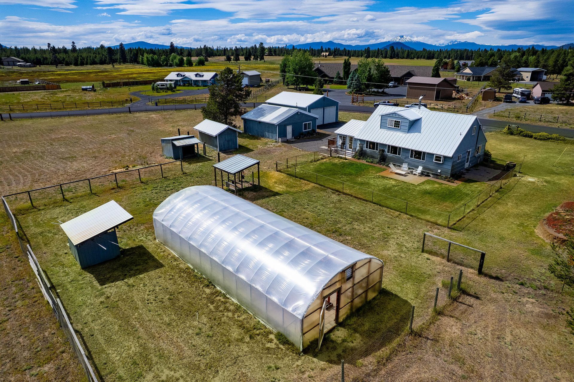 Back on market! This property truly has it all--function, beauty, space, and sustainability on 2.28 acres! A 28x35 garage/shop with tall doors, auto openers & concrete floors is perfect for projects, storage, or hobbies. A 784 sq ft multi-use outbuilding adds flexible space for guest quarters, a studio, or workshop. The landscaped grounds offer underground sprinklers, fenced side yard, patio, walkway, and views of the Cascades & Paulina Peak. Inside, the 3-bedroom home offers peaceful country living with a cozy wood-stove, A/C, built-ins, and south-facing windows for abundant natural light. The sunroom is perfect for year-round use, while the kitchen features pine cabinetry with glass fronts and a spacious pantry. Durable metal roof & siding, plus two additional sheds. Embrace sustainable living with a 50x20 double-insulated greenhouse with power & water. Paved roads & driveway. Corner lot on a quiet dead-end street near the Little Deschutes River & Quail Run Golf Course.