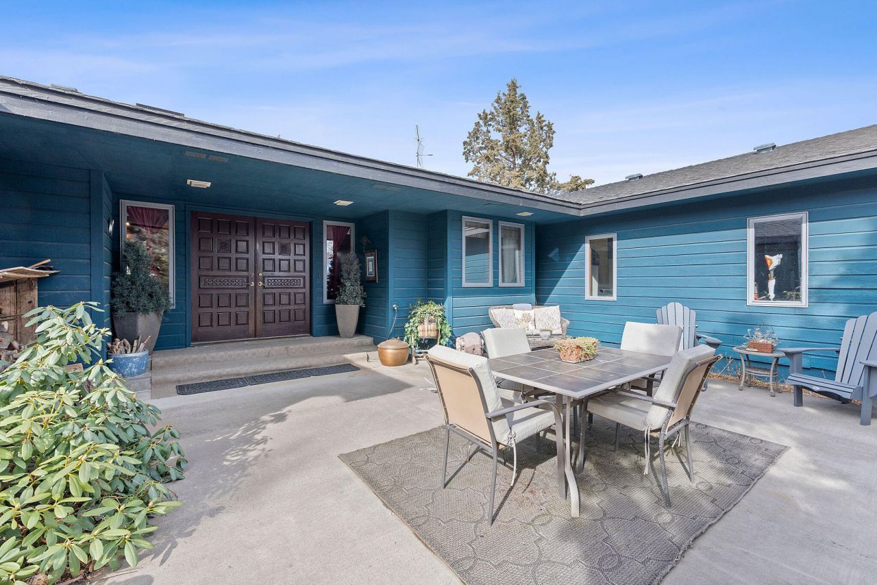 Exceptional 5.5-acre Redmond estate offering space, privacy, and versatility. This 3,008 sq ft home features 4 bedrooms and 3 full baths centered around a private courtyard with tranquil water features and stunning sunset views. Vaulted wood ceilings, exposed beams, and a dramatic stone fireplace create warmth and character, while expansive windows blend indoor and outdoor living. The kitchen includes stainless appliances, abundant cabinetry, and a central island. Mature landscaping, fruit trees, and garden areas enhance the setting. A 3,200 sq ft heated shop with 14-ft doors, 3-phase power, and separate septic offers flexibility and income potential (buyer to verify). Additional foundation with utilities allows future possibilities. New 409-ft well and brand-new roof (March). Minutes to Smith Rock and endless recreation.
