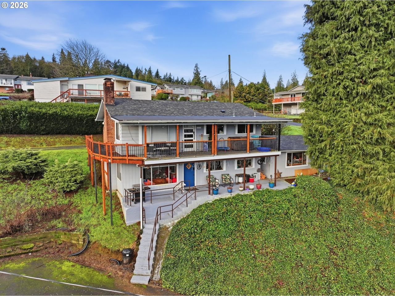 Updated two-story duplex offering sweeping territorial views of three mountains and the Columbia River. This 1,872 SF property features two separate units-one 2-bedroom and one 1-bedroom-each with its own full kitchen, creating an ideal setup to live in one and rent the other. Both units feature gas fireplaces, formal dining spaces, and access to a covered deck and patio, perfect for relaxing or entertaining while taking in the ever-changing river and mountain scenery. Each unit has its own gas furnace, gas water heater, and electrical panel, along with separate utility meters for added efficiency and convenience. A shared utility room offers hookups for individual washer and dryer sets. Additional highlights include a shop and garage with built-ins, providing excellent storage and workspace. Ideally located just one block from two neighborhood parks and a dog park, with easy highway access for effortless commuting and outdoor adventures!