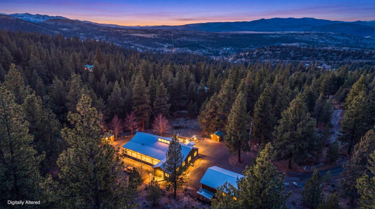 Beautiful five-acre property nestled in the pines and bordering BLM land, offering privacy and access to the outdoors. This 2,412 sq ft home features four bedrooms and three bathrooms with pine accents throughout. The main primary suite includes a sliding glass door to the covered back deck, double vanity, soaking tub, tile shower, and walk-in closet. A second primary suite offers a shower surround and closet with bypass barn doors. Stay comfortable year-round with a Blaze King woodstove and a ducted heat pump. The 1,040 sq ft detached garage/shop includes a concrete floor, insulation, sheetrock, 220 power, and an oil monitor stove. Additional features include a 12′ x 10′ hickory storage shed, fenced backyard for pets, partial perimeter fencing, well, septic system, backup generator wired to the house, and a circular driveway. This property is situated only a few minutes away from town.