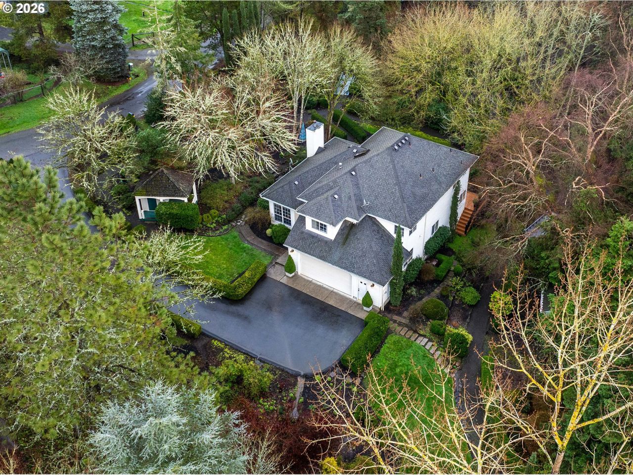 Tucked away on over an acre in the heart of Newberg, this exquisite two-story home offers a rare blend of privacy, elegance, and lush natural beauty, with a tranquil creek gracefully winding through the property and enhancing the serene, park-like setting. A beautifully landscaped driveway and grand entrance welcome you into an impressive foyer, with a private office just off the entry and a formal living room showcasing vaulted ceilings and a cozy fireplace. The kitchen is both timeless and functional, featuring gorgeous wood cabinetry, stainless steel appliances, abundant storage, and real hardwood floors, flowing seamlessly into the dining area with direct access to the expansive back patio. Ideal for entertaining or peaceful evenings at home, the patio overlooks a stunning backyard framed by mature trees, rich greenery, and the gentle sights and sounds of the creek, offering exceptional privacy and a true retreat-like atmosphere. The main level also includes a half bath and a full laundry room with utility sink. Upstairs, you'll find three generously sized bedrooms and a full hallway bath, while the serene primary suite impresses with vaulted ceilings, a spacious walk-in closet, and a luxurious ensuite complete with double vanity and large glass shower. This remarkable property is peaceful, refined, and immersed in nature at every turn.