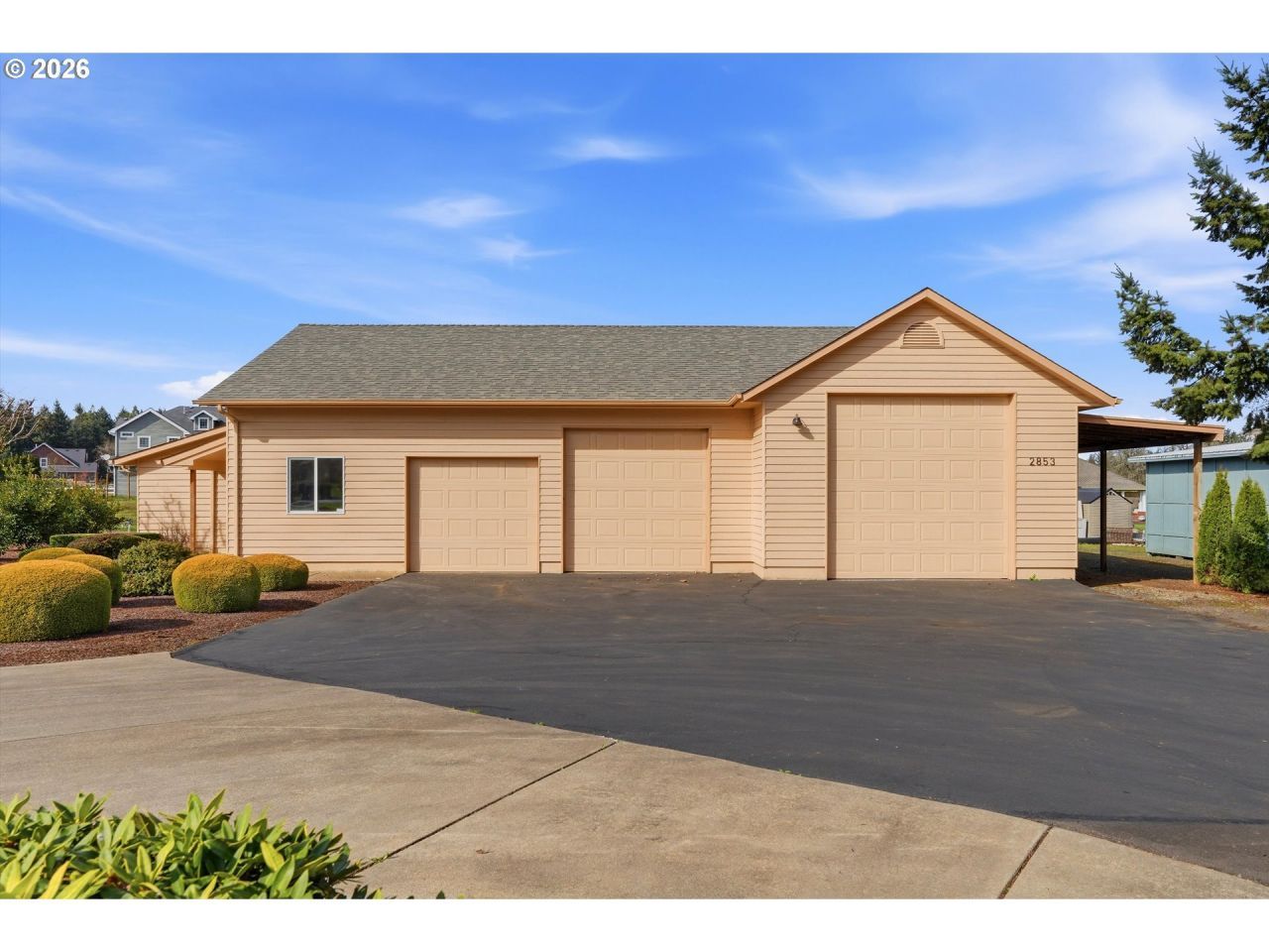 Custom high-end build and meticulously maintained single-level home on 2.51 acres featuring exceptional shop space and luxury architectural design. The 2,194 sqft home offers vaulted ceilings, hardwood floors, tray ceilings, skylight shafts, and clerestory windows filling the home with natural light. Enjoy a chef's kitchen with granite counters, professional gas stove, views of the pond and water feature. Property includes an 1,880 sqft finished 3-bay shop with RV plug, attached studio, and outbuildings. Inside, the thoughtful layout flows between the formal dining room, family room, and living room with gas fireplace and flush tile hearth, all centered around a spacious kitchen designed for entertaining. The kitchen features granite countertops, cook island, stainless appliances, under-cabinet lighting, breakfast nook, and sliding doors leading to the covered patio with gas BBQ stub. The primary suite offers private patio access, tiled bathroom floors, soaking tub, offset water closet, and an enormous walk-in closet with built-in organizers. Architectural details throughout include tray ceilings, dramatic skylight shafts, and angled clerestory windows that follow the rooflines. The property is equally impressive outside. The 1,880 sqft high-end shop features wood framing, fiber cement siding, finished interior, 12' sidewalls, RV plug, and abundant 110v outlets. Two bay doors serve the 36x30 section while the 20x40 section includes a larger RV storage door. Attached to the shop is a 12x20 studio with water and power, plus a 12x34 lean-to machine shed for additional vehicle storage. Additional structures include a 1,200 sqft metal storage building with power and a machine shop toward the rear of the property. A circular driveway winds through the manicured landscaping, connecting the home and shop with a large stamped concrete driveway and additional RV parking. A rare opportunity for luxury single-level living with extraordinary shop space.