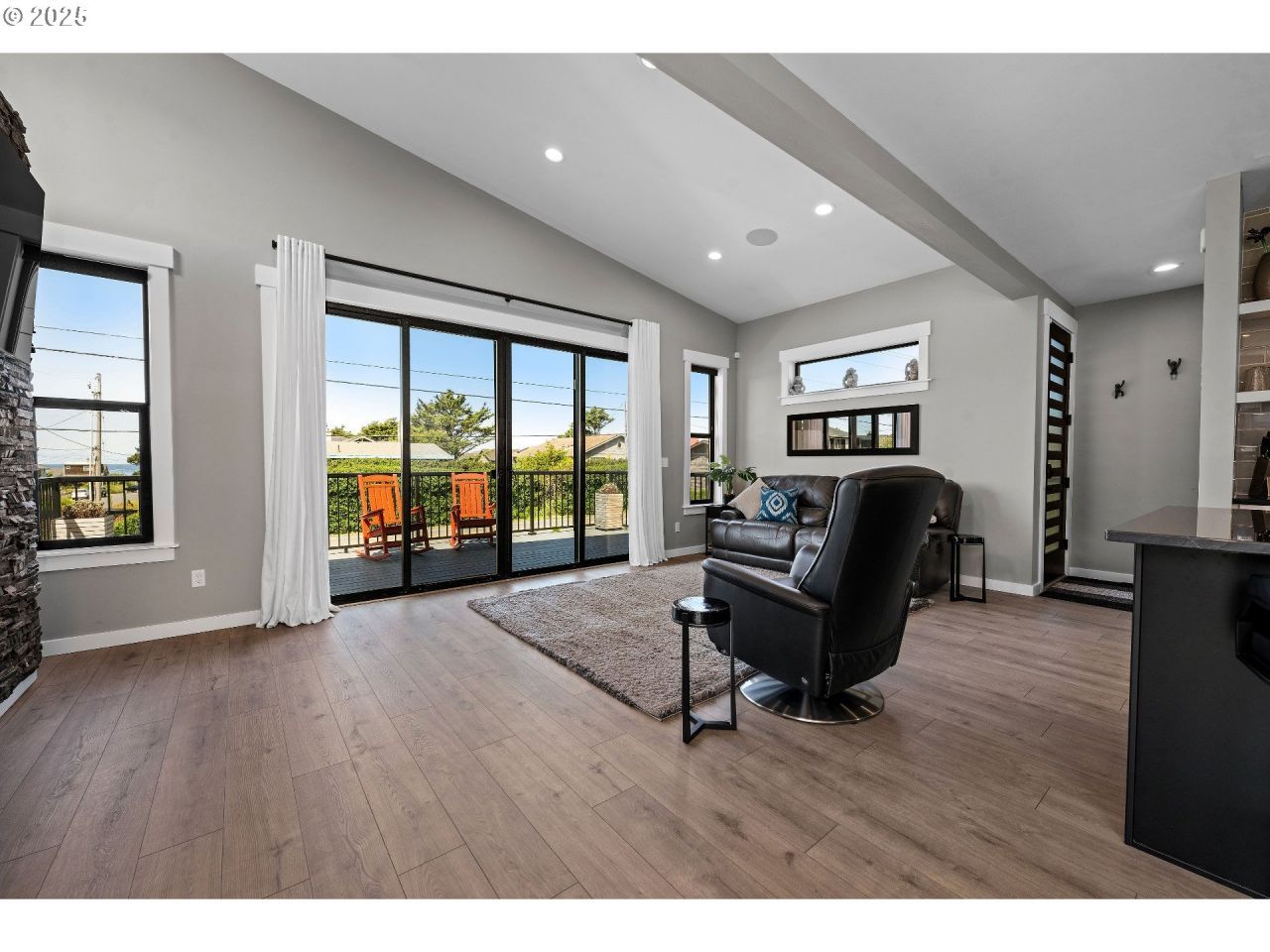 Modern coastal living - just one block from the beach. This custom Cannon Beach home blends contemporary architecture with smart home technology and ocean views from both levels. The main floor is open and designed for gatherings, featuring vaulted ceilings, a gas fireplace, and sliding French doors that open to a Trex deck. The chef's kitchen offers a quartzite island, Bosch stainless steel appliances, and walk-in pantry. Upstairs, a second living area with wet bar, beverage fridge, and lofted daybed is the perfect spot to relax with ocean views. The primary suite features a striking ensuite bath with black flagstone, rain shower, and walk-in closet. Additional highlights: zoned whole-home audio, 8' solid wood doors, durable LVP flooring, and a two-car garage with EV charging, storage, and outdoor hot/cold plumbing for sandy days. Located in the Tolovana neighborhood, just one block from the beach. Ask for the Special Features list for more.