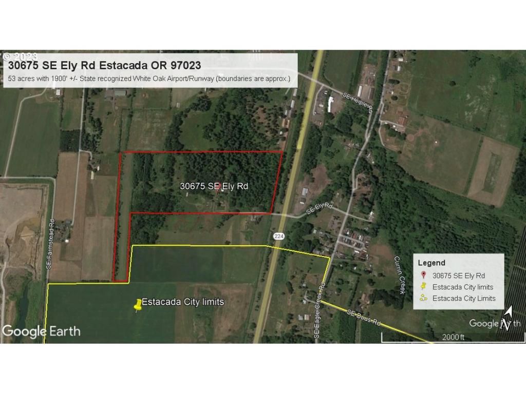OWN YOUR OWN AIRPORT! State of Oregon recognized private grass strip over 1900' long on 53 private acres. Located in east Clackamas County just outside of the Estacada City limits on two separate tax lots. Possible future development potential should Estacada expand the UGB. Come build a home and hanger for your plane. Existing manufactured home on property is of little value but could. Buyer to do own due diligence.