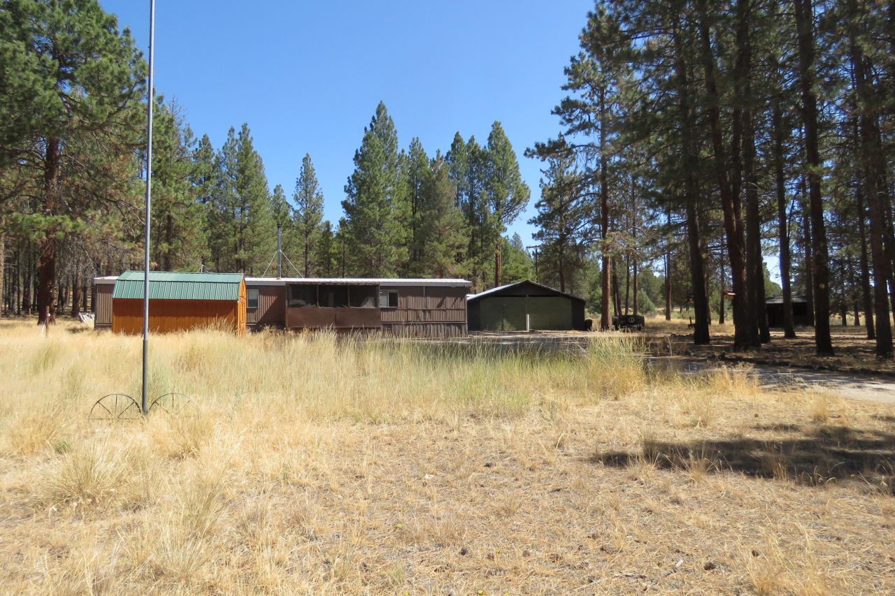 Home among mature Ponderosa Pines on 2.8 Acres. This 3 bedroom 1 & ½ bathroom home has newer floors, metal roof, with certified wood stove plus elect heat to keep home warm in the winter and 3 AC window unites keep home cool in the summer. Shop has ½ dirt floor ½ concrete. Plus there is a covered wood shed, chicken coop, Pump house and additional dry Storage. Home has covered porch front and back entries.