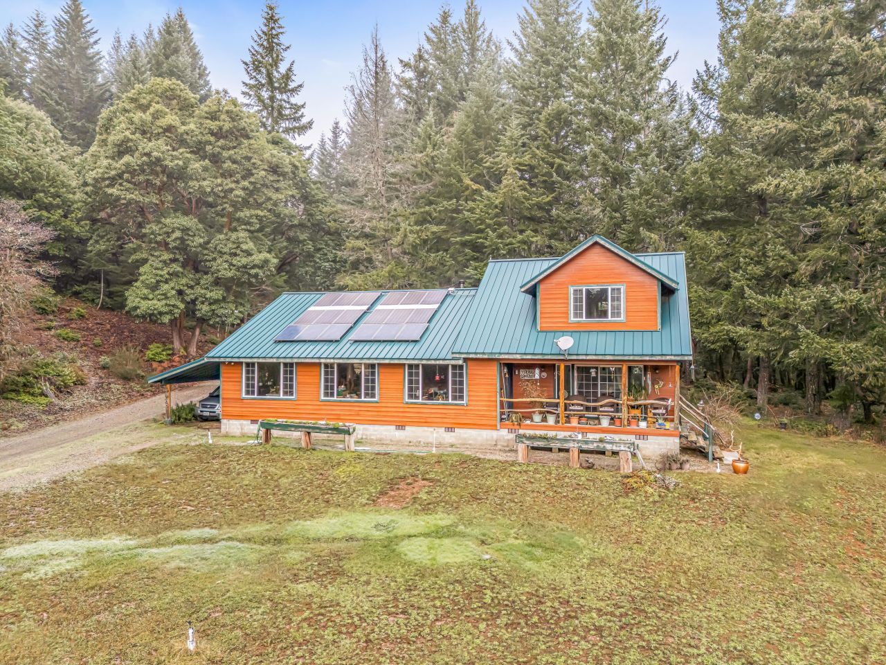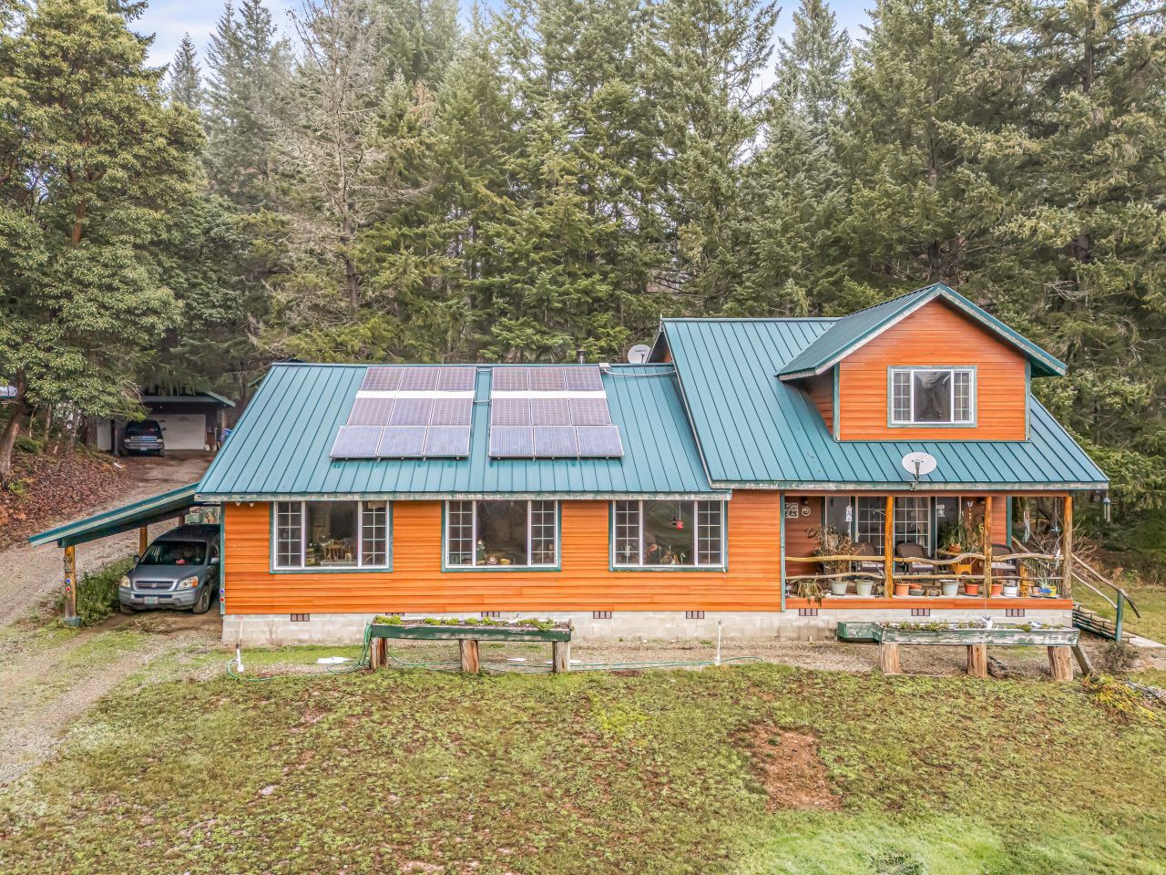 Nestled on 80 private acres along the scenic Redwood Highway, this unique 2-bedroom, 2.5-bath property offers a rare blend of space, views, and rustic charm. The home features a cozy cabin-style feel with a distinctive, artistic design, an open loft that adds character and flexible living space, and is fully off the grid for a truly self-sufficient lifestyle. Enjoy peaceful mornings overlooking your own pond, surrounded by beautiful forested landscapes, three forest views, and expansive territorial scenery. A detached 2-car garage and covered RV parking provide ample space for vehicles, storage, or outdoor toys. With abundant room to roam, garden, explore, or unplug, the land offers endless potential. This special property delivers privacy, tranquility, and a strong connection to nature while showcasing stunning views and a one-of-a-kind setting in Southern Oregons countryside. Ideal for full-time living or a private getaway with year-round enjoyment. Open skies and wildlife await.