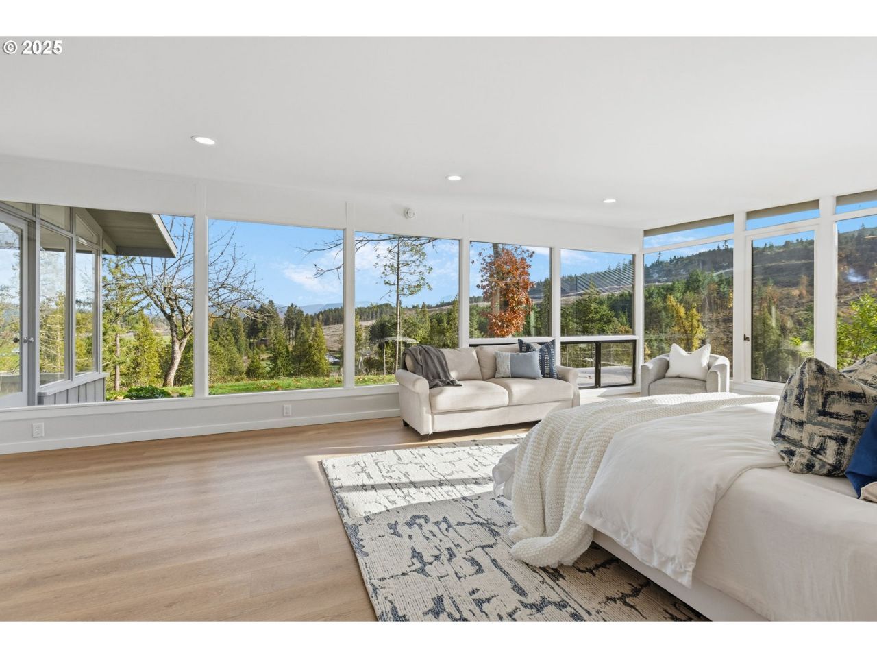 Experience refined Northwest living in this striking Mid-Century / NW Contemporary 5-bedroom, 3-bath, 3,288 SF luxury estate set on 29.9 private, usable acres in desirable Pleasant Hill, Oregon. Designed for those who appreciate both architectural elegance and the beauty of country life, this property offers panoramic mountain and valley views from nearly every room. The open concept living area showcases vaulted, beamed ceilings, quartz countertops, stainless steel appliances, and expansive windows that fill the home with natural light. The primary suite is a private retreat featuring a fireplace, free-standing soaking tub, walk-in closet, panoramic sitting area, and private deck overlooking the landscape-perfect for enjoying tranquil mornings and eastern sunrises. The land itself is a highlight-mostly open and gently rolling, ideal for hobby farming, equestrian use, gardening, small-scale agriculture, or future home expansion. Outdoor amenities include a detached sauna, shop, barn, chicken coop, and garden area, providing both comfort and versatility for rural living. Perfectly situated for those seeking privacy without isolation, the property is just minutes from Eugene and Springfield, near Dexter Reservoir, Elijah Bristow State Park, the Willamette River, and local vineyards and scenic trails-offering the ideal balance of convenience and outdoor adventure. This remarkable property offers multiple purchase options: acquire the entire 123+ acre estate for $1,650,000 (MLS#619358644), the residence on 30- acres for $1,250,000 (MLS#526610840), or the adjoining 93+ acre parcel individually for $600,000 (MLS#355766133). Together, they create one of Pleasant Hill's most extraordinary luxury acreage estates, offering panoramic views, privacy, recreation, and investment potential.