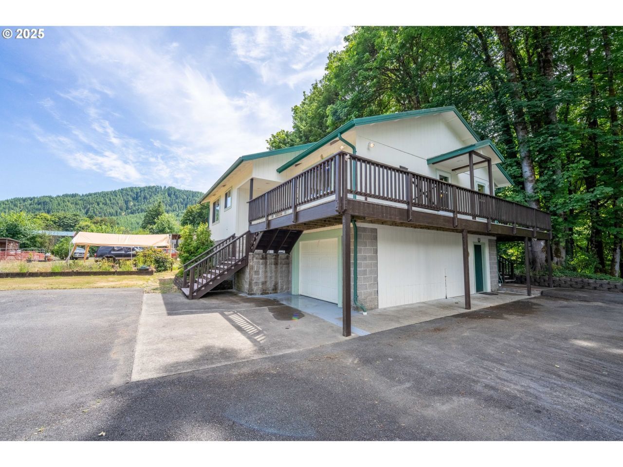 Custom Umpqua Riverfront Home with Unique Charm and Room to Play. Embrace riverfront living along the beautiful Umpqua River in this custom-built home by Rose Brothers Construction, offering quality craftsmanship and thoughtful details that make everyday living feel special.Inside, stunning maple floors reclaimed from an Arizona gymnasium add unique character, complemented by soaring tongue-and-groove vaulted ceilings, skylights, and recessed lighting that keep the living spaces inviting. The bright kitchen is perfect for preparing meals to enjoy indoors or out on the expansive wrap-around deck overlooking the river.A spacious downstairs recreation room with a pellet stove provides a comfortable retreat for gatherings, hobbies, or simply unwinding after a day on the water. Outdoor enthusiasts will appreciate the large grassy yard-ideal for yard games, relaxing in the sunshine, or hosting family and friends.Practical features include a durable metal roof, an attached one-car garage for everyday convenience, and a detached three-car garage offering ample space for vehicles, toys, boats, or workshop needs. There's also a large parking pad to accommodate guests or recreational vehicles.Whether fishing, swimming, or exploring the scenic surroundings, this inviting riverfront property offers a wonderful setting to enjoy life's next chapter in beautiful Oregon.