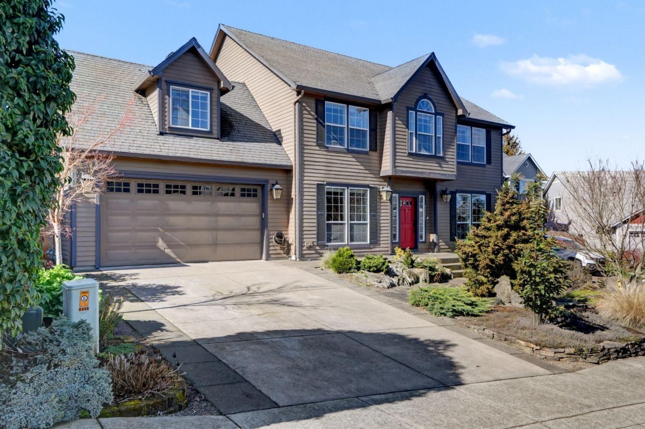 Well-maintained and very energy efficient 4 bed, 2.5 bath home offering 2,627 SF on a quiet cul-de-sac. Flexible layout includes a main floor bedroom, formal living & dining rooms, and both living and family rooms, each with gas fireplaces. Light-filled nook off the gourmet kitchen featuring granite countertops, cherry cabinetry, stainless Frigidaire appliances, and a walk-in pantry. Cherry cabinets continue throughout the bathrooms and laundry room for a cohesive, high-quality finish. Hardwood flooring on the main level. Spacious bonus room provides ideal space for media, office, or playroom.Primary suite features a walk-in closet, jetted tub, walk-in shower, and vaulted sitting/retreat area. Dual heating and cooling systems provide efficient comfort year-round. Central vacuum and central speakers included. The backyard is a true highlight with seven raised garden beds, fruit trees, grapevines, and abundant flowering plants, all within a fully fenced and beautifully landscaped.