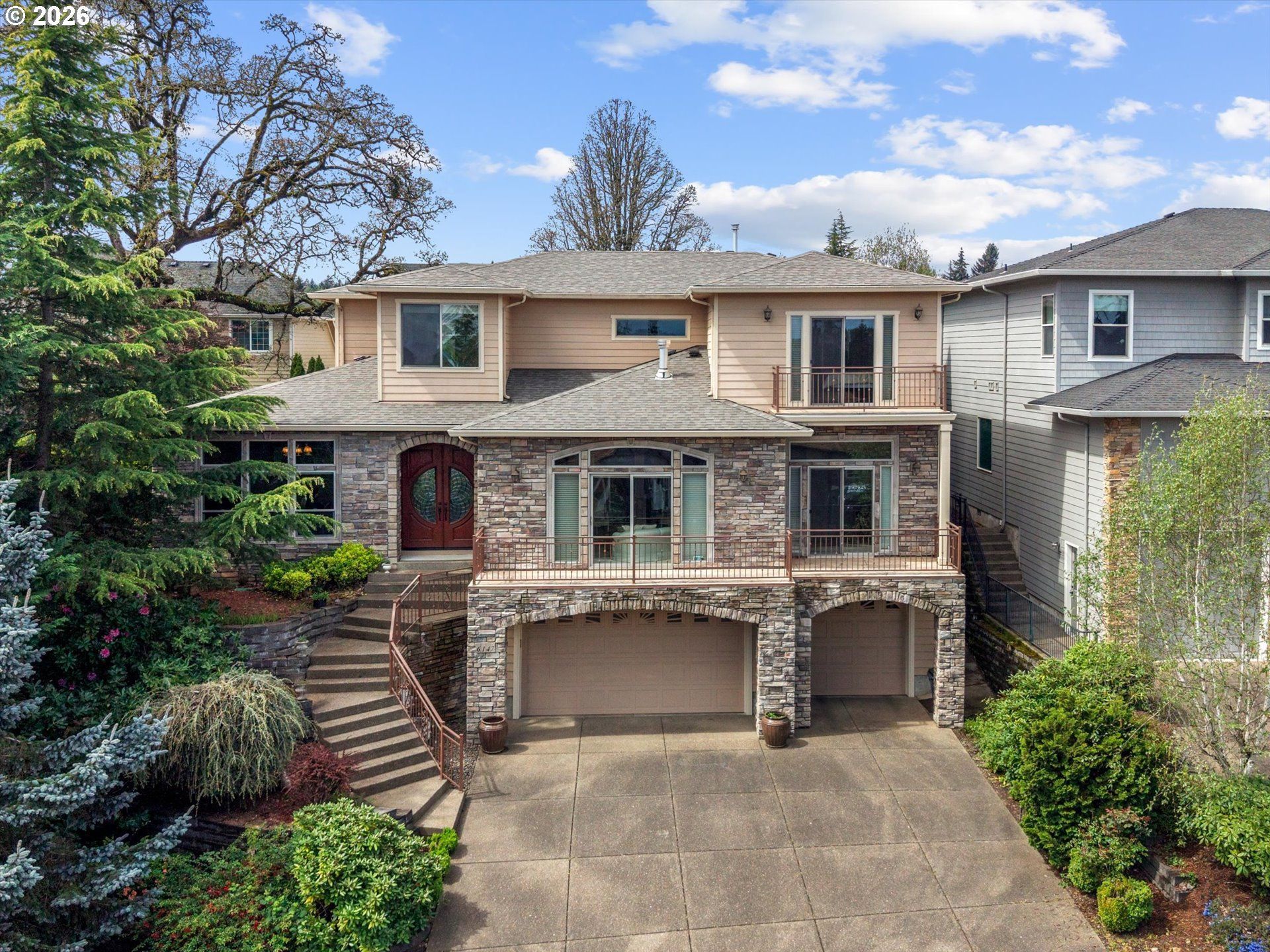 This custom-built home has been meticulously maintained, is built to entertain, and is just blocks away from the Creekside Golf Club. Enjoy sunrise views from the large East-facing views and multiple balconies out of the primary bedroom, office, and living room. On clear days you even get a peek of Mt. Jefferson! The chef's kitchen makes cooking large meals stress free with ample counter space, a large island, a gas range, and built-in stainless steel appliances. Then choose where you relax with dual living rooms and a formal dining room. Three bedrooms are located upstairs, with two true primaries. Both primary bedrooms offer ensuite bathrooms and one has a large walk-in closet. The backyard offers true privacy with mature arborvitae, blueberry, raspberry, and blackberry bushes. Looking for storage for your RV, boat, or ATV? The oversized 4-car garage provides additional storage. A new roof was installed in July 2025 and the sellers are willing to stretch the carpets prior to closing to give this home that brand-new feel.