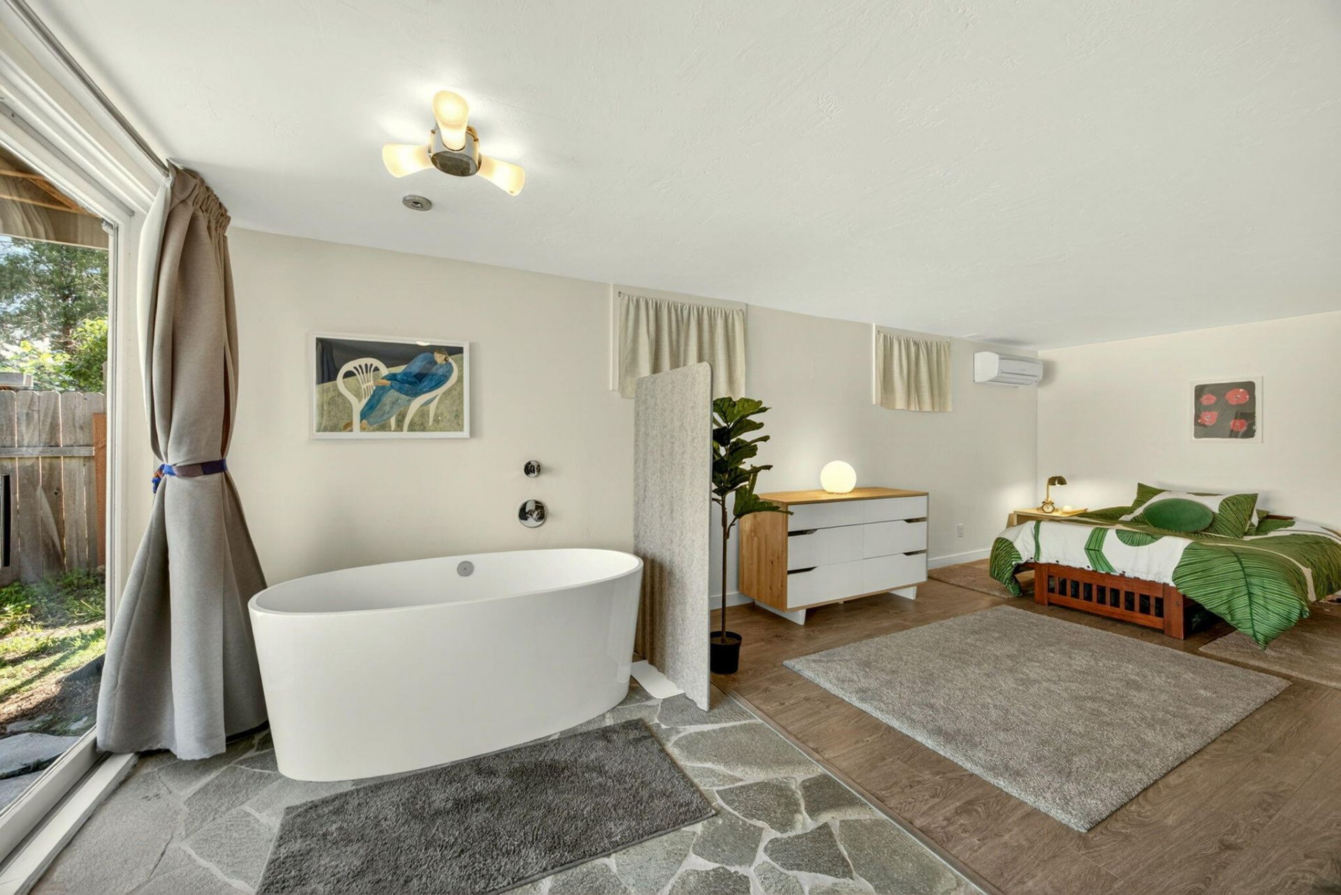 Perched on a corner lot framed by five mature Deodar cedars and a striking giant sequoia, this thoughtfully maintained home offers treetop outlooks and filtered glimpses of the Rogue Valley. The main level features large windows, hardwood floors, and a living area with fireplace. A deck extends the living outdoors. Downstairs offers a flexible primary suite with open-concept bath, freestanding soaking tub, mosaic tile wet area, and radiant heated floors, a design-forward blend of bedroom and spa-inspired living. The separation between levels offers potential for multigenerational living, extended guest use, or rental flexibility. Major updates include sewer lateral (2022), roof (2013), exterior paint (2023), and professional tree pruning (2026). Deer-fenced yard with dual pedestrian gates and rear vehicle access. Conveniently located in Ashland, this home balances setting, privacy, and character.