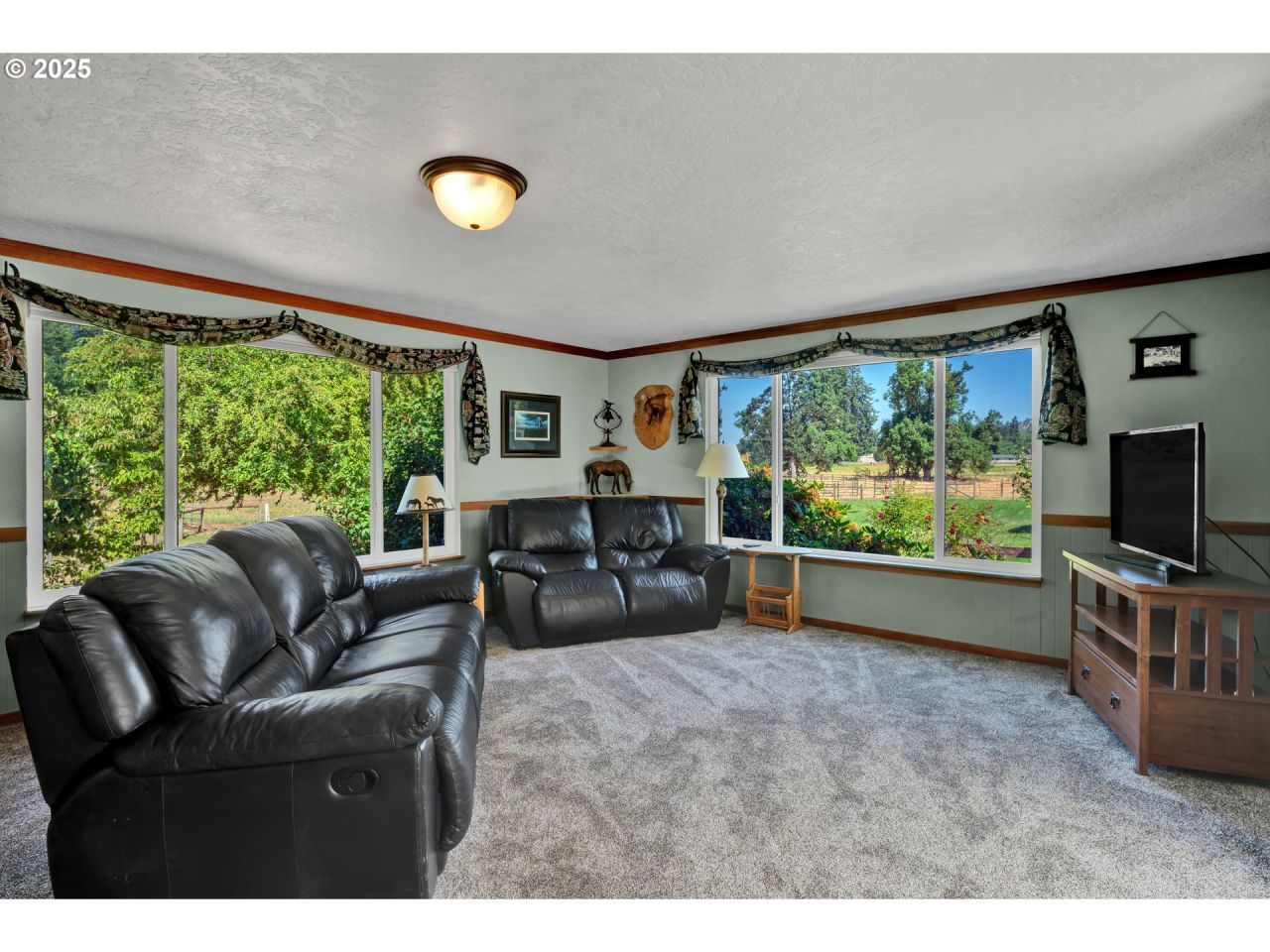 Nestled on 10 acres in the midst of serene landscape, discover this exceptional Pleasant Hill-area estate that offers a unique blend of rural tranquility and modern convenience. Located just minutes from Mount Pisgah Arboretum and Howard Buford Recreation Area, it provides endless trails perfect for riding and exploration.Currently a dog agility training center, this estate is ideally set up for horses, cattle, goats, or llamas. The well-cared-for home features a kitchen with quartz countertops and pull-out shelves, offering views of Bear Mountain. The primary suite includes a cozy electric fireplace, a walk-in closet, private bath access, a slider to the backyard, and new carpet. Its en-suite bathroom boasts a programmable heated tile floor and dual controls shower. A unique vent above the primary suite door draws heated air from living room's woodstove for efficient warmth.The inviting living room, with new carpet and a newer woodstove, offers breathtaking Mount Pisgah views. An updated main bathroom features a walk-in shower and granite countertops. The laundry room offers practical storage with pull-out drawers.The home boasts a new roof (2022), new rain guard gutters (2024), and upgraded underfloor insulation (2024).Equestrian amenities are superb: a 50x94 indoor riding arena with a tack room, a 24x24 foaling stall, two turn-out stalls, a 24x36 turn-out/stock area, an outdoor riding area, and a round pen. Additional storage and shop is found in an 84x84 barn, 1/2 of barn is set up as shop area, both barns have 220 electrical power. Plus two 24x36 garages (3bays each).The fertile grounds include fruit trees (peach, plum, cherry, pear) and a seasonal creek. Irrigation rights from the Coast Fork of the Willamette River offer potential for crops.This versatile property previously had an ADU mobile home (hardship) and can accommodate RV parking with existing hook-ups. Reserve a Showing of this Exceptional Pleasant Hill-Area Estate today!