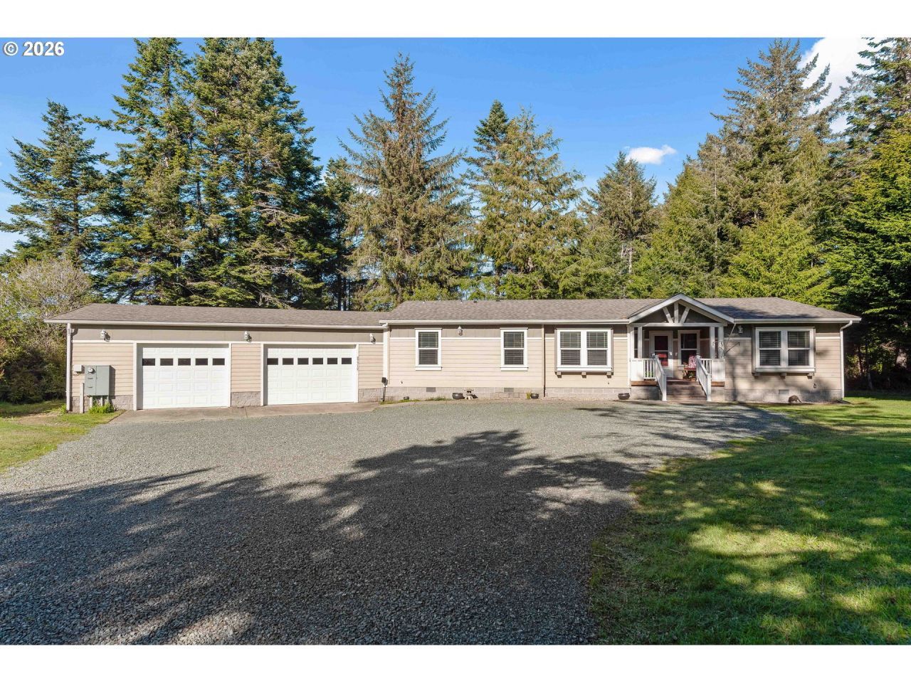 Welcome to this beautiful 2014 single-level triple-wide manufactured home offering 2,400 square feet of thoughtfully designed living space. With 4 bedrooms and 3 full bathrooms, this home features a bright, open-concept living, kitchen, and dining area-all surrounded by picturesque Oregon landscaping that creates a peaceful, private setting. Designed with comfort and flexibility in mind, there's room for everyone to spread out and enjoy. The spacious primary suite includes a cozy sitting area, generous bedroom space, a large walk-in closet, and an ensuite bath complete with double sinks, a walk-in shower, and a luxurious soaking tub. Bedrooms two and three create a welcoming guest retreat, connected by a charming sitting area and serviced by a full bath with walk-in shower. The fourth bedroom offers direct access to the main full bathroom, featuring a convenient tub/shower combination. The expansive living and dining area boasts high ceilings, abundant windows for natural light, laminate flooring, and a glass door leading to a covered deck-perfect for seamless indoor-outdoor living and entertaining. The kitchen opens beautifully to the main living space and features tile flooring, a large island, plentiful cabinetry and counter space, plus a pantry for added storage. Recent updates include a new roof in 2023 and new carpet in primary making this home truly move-in ready.And the garage? It's a standout feature. The impressive 1,480-square-foot garage offers high ceilings, drywall finish, electric garage doors, and ample room for vehicles, hobbies, storage, or workspace needs. Outside, both front and back yards showcase lush green lawns and mature trees. The backyard also includes a fenced area ideal for pets. Located just minutes from beaches- sitting on the back patio you can hear the ocean, fishing, golfing, and the charming shops this property combines peaceful country living with convenient access to coastal amenities.
