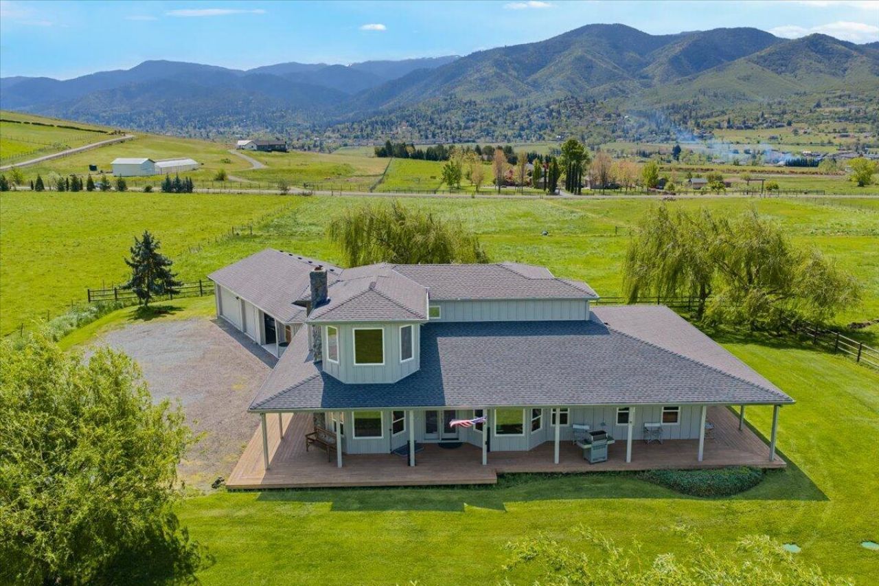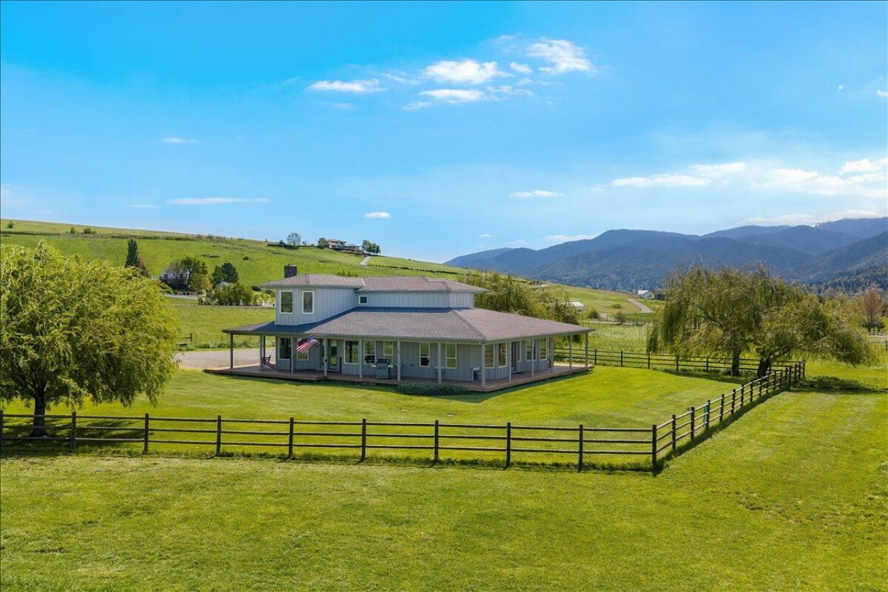 Incredible opportunity in Ashland -- 9.31 fully pressure-irrigated acres of picture-perfect country living with sweeping views. Relax on the full wrap-around porch and savor sunrises and sunsets from your swinging bench seat. The 2,846 sq ft home offers 4 bedrooms, a cozy gas fireplace with ceramic logs, dual-zone heat pump, natural gas furnace, and a tastefully updated 2016 kitchen. Fully fenced and cross-fenced with electric, perfect for livestock. A 30x40 barn includes four powered stalls, tack room with bunk, hay loft and elevator; plus round arena, chicken coop and storage shed. Detached 3-car garage with 400 sqft ADU/guest house for income or multigenerational living. New 25 GPM well pump and Charter high-speed internet. Turnkey, functional, and ready to enjoy!