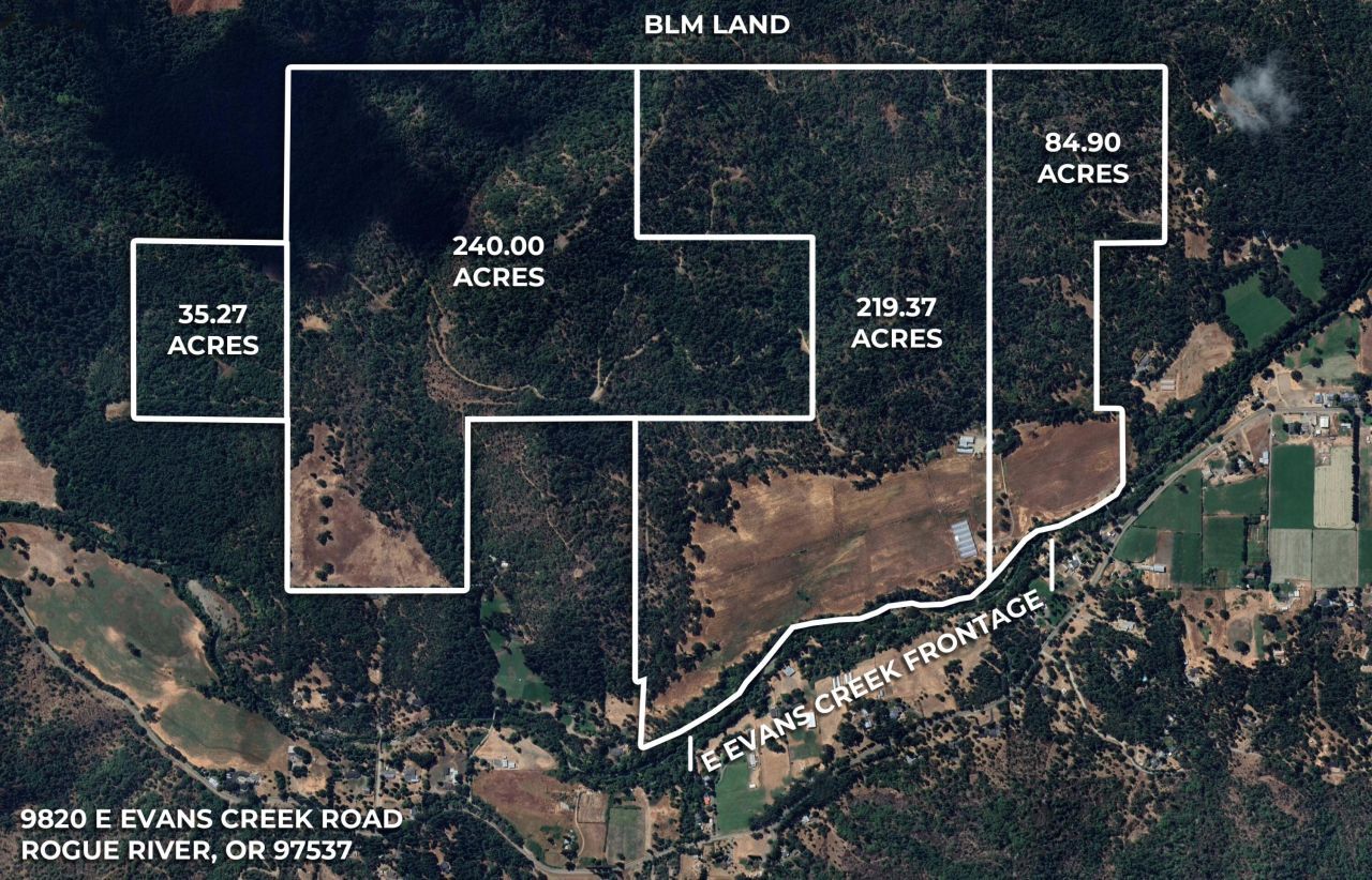 Location, location, location! If youre looking for pasture in the heart of Southern Oregon, this is the one for you! This one-of-a-kind property features 579.54 acres (57+ acres are irrigated and irrigation rights date back to 1881), 4 tax lots (Zonings are EFU & WR), marketable timber, multiple outbuildings, 6 industrial greenhouses, 1200 amps of power, large 3960 sq ft barn, homesite approval, gated access, and nearly 3000 ft of E Evans Creek frontage! Property backs up to BLM and offers a very pleasant setting that feels private yet within 15-20 mins from downtown Rogue River. Truly a perfect opportunity for anyone that wants to build their dream home on a generational ranch and/or grow marijuana. Owner carry terms are considered too. This one wont last long on the market, so contact your agent today for a personal tour, before its too late!
